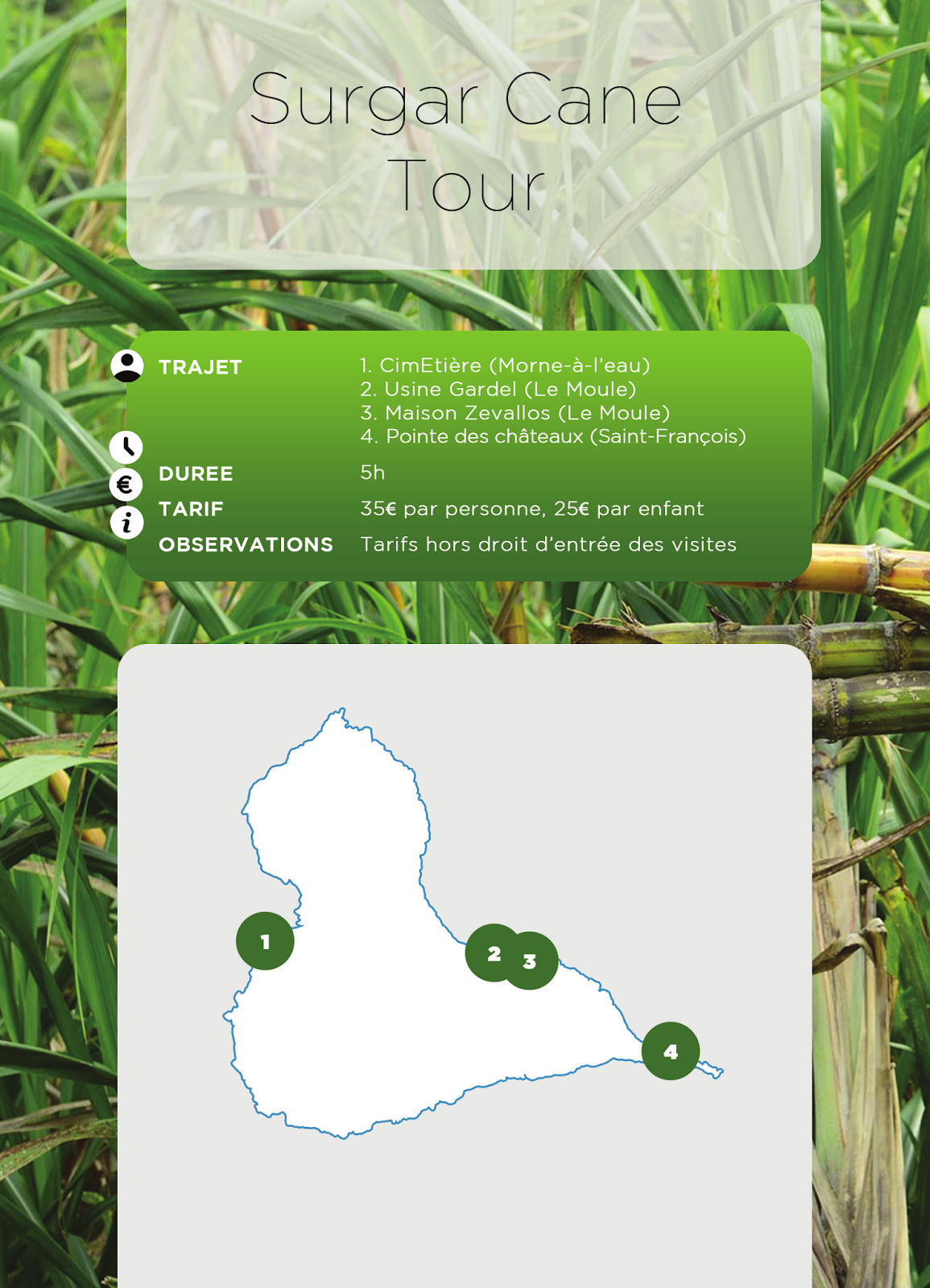 C’est le circuit qui vous permettra de visiter les fameux champs de cannes à sucre qui existent depuis l’ère de l’esclave , ainsi que l’usine Gardel au Moule. Gardel étant le principal producteur de sucre en Guadeloupe .