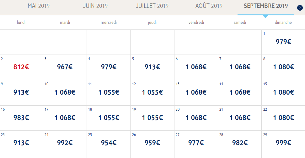 Pour les mois d’Octobre , Novembre , Décembre 2019 et Janvier, Février 2020, les prix varient de 982€ à 1219€.